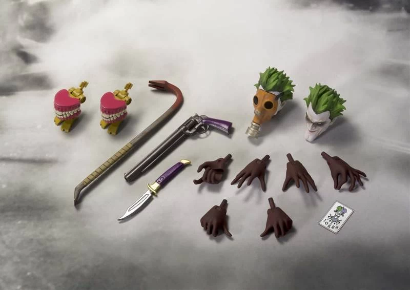 Just when you thought things couldn’t get any crazier Tamashii Nations brings on the insane. The Joker, “The Clown Prince of Crime” joins the S.H.Figuarts advanced action series as he appears in “Injustice: Gods Among Us” featuring wicked proportion and detail, as well as ridiculous articulation. Deluxe figure set includes a special, original design gas mask along with an insane array of accessories: interchangeable head part, interchangeable hand parts (3 sets), knife accessory, crowbar accessory, gun accessory, chattering teeth x2, and Joker card. Ideal for posing with S.H.Figuarts Batman (INJUSTICE Ver.) to recreate the ultimate arch-rival battle scene.